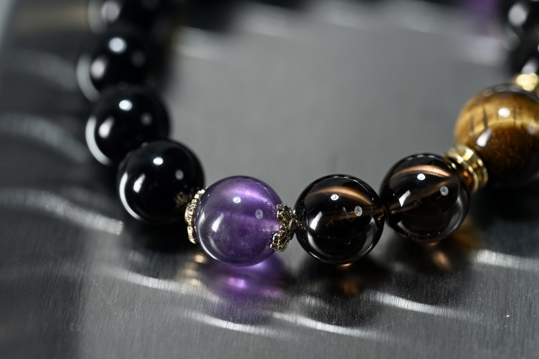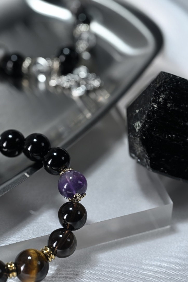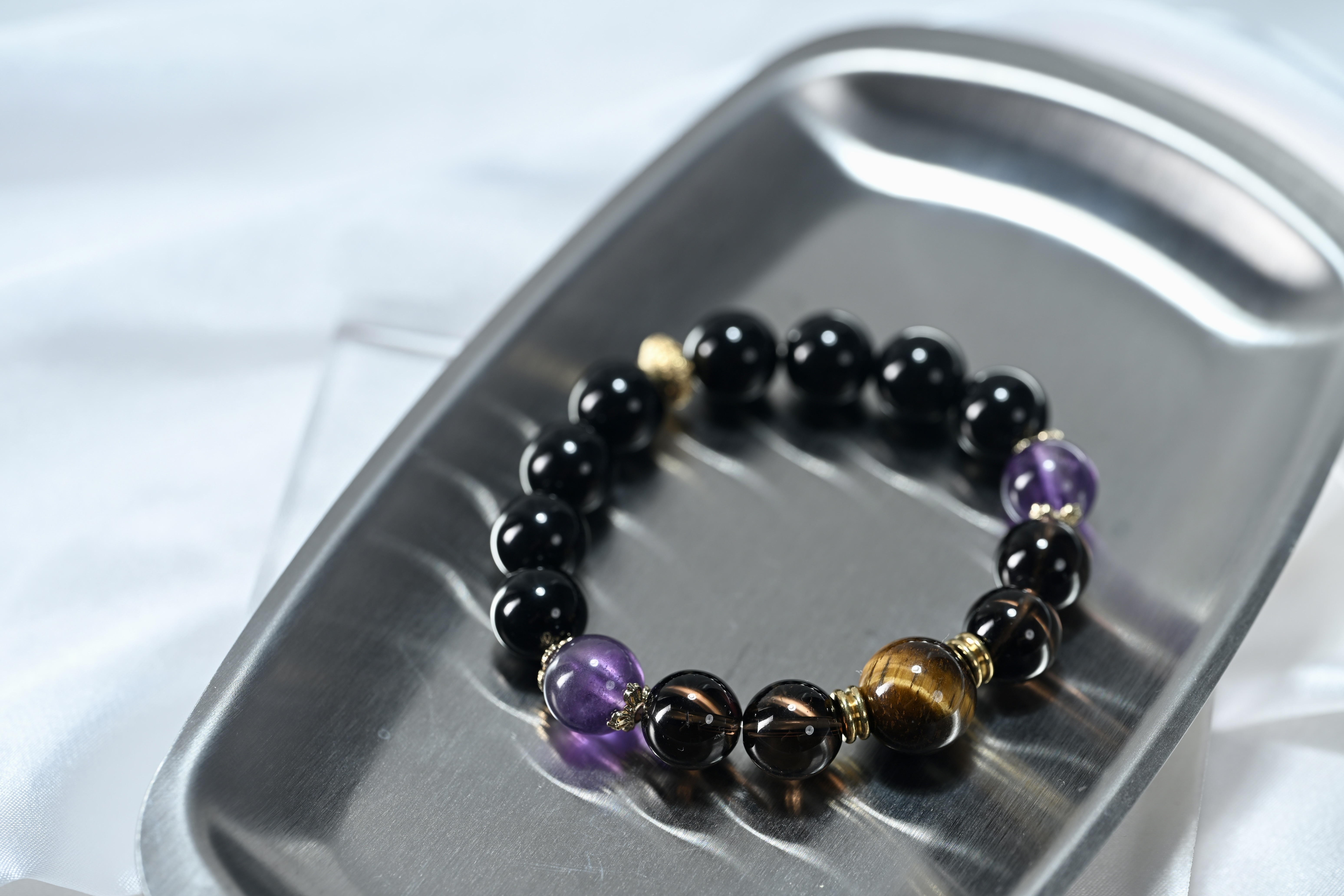 水晶:茶晶、黃虎眼、紫水晶、黑曜石